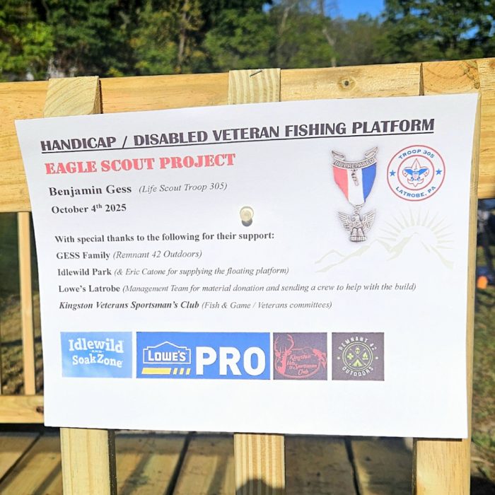 National TU introduced the program of fly fishing to veterans many years ago to bring the therapeutic healing of fly fishing to our nation’s heroes. First responders were added a few years back and the program is now called the TU Service Partnership honoring those who have served their country and communities. TU is very grateful that Kingston Sportsmen agreed to partner with them again this year. Their manicured club grounds provide ADA access to their lake, pavilion and restroom facilities. Benjamin Gess from Troop 305 finished his Eagle Scout project at 9 PM the evening before. It’s an ADA access floating, fishing dock. “It’s been almost three years since I first came up with the design.” noted Benjamin. “I wanted it ready for the veterans and first responders today”.